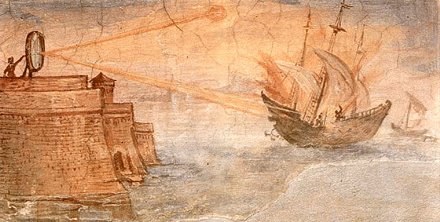 According to one tale, apparently first known in the Middle Ages, Archimedes designed a system in which mirrors were used to direct concentrated beams of sunlight at Roman ships, causing them to catch fire. This supposedly occurred during a siege of Siracusa that lasted from 214 to 212 BC, the Second Punic War. Archimedes was killed by a Roman soldier in 212 during that siege.
