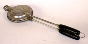 The Toas-Tite consists of two cast-aluminum “clam shells” joined with a hinge and opened and closed with two long handles. In the most basic use of this gadget, one puts a slice of bread on one of the shells – with a little butter on the down side to prevent sticking. Lay on some cheese, maybe a slice of tomato, and then put on the second slice of bread — again with a little butter on the outside. Close the handles and cut away the excess bread. Then grill the contents over whatever heat source is handy, turning the Toas-Tite frequently to avoid burning the bread while the cheese melts. When the Toas-Tite is opened, the result is a sealed round hot sandwich.