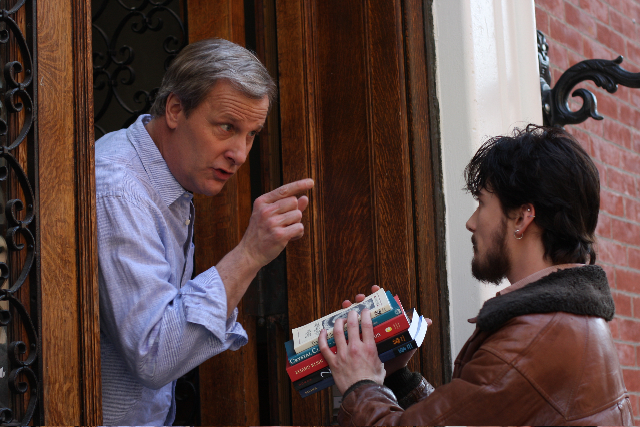 Faber comes in contact with Lauren because he needs treatments for his bad back. Lauren and her receptionist, Anne (Olivia Thirlby), don’t know what to make of the volatile and manipulative Faber, but Faber is attracted to Laurenr — the first such attraction for him in decades — and he develops an uncharacteristically benign relationship with her young son, Alex (Max Antisell). Faber wants to get rid of some of the books that he has accumulated in his apartment, and he tries to sell them to Kris, who has no cash to buy them with. The impending loss of his store is not the worst of Kris’s problems, though. His effort to stay sober isn’t helped by the fact that he lives with an endearing but alcoholic father. In a desperate attempt to keep from slipping under the waves, Kris blackmails Faber into an arrangement in which Kris will take a few of Faber’s excess books off his hands each time Faber, drawing on his supposed supernatural source of wisdom, answer one of Kris’s questions .
