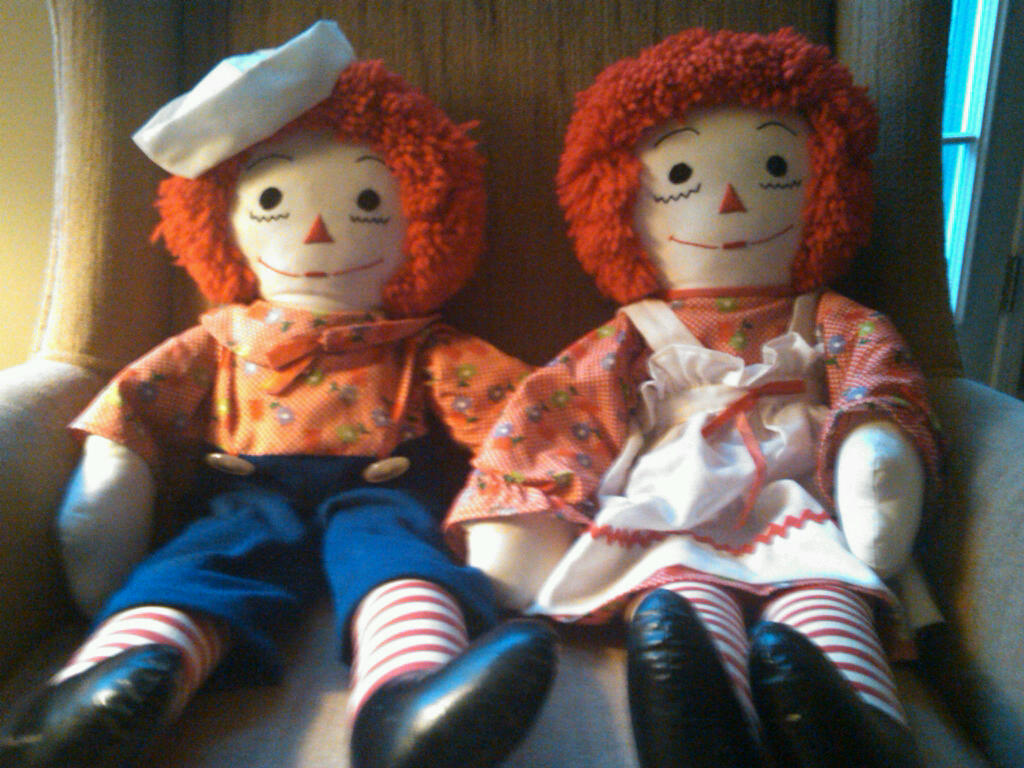 So last Sunday I brought Raggedy Ann and Andy, two large dolls that I bought for Pat about 35 years ago. They were hand-made by a woman who at the time was about 100 years old, and they are exquisite. Pat’s appreciation of their exquisite-ness has faded as the house has become increasingly burdened with more than 40 years of such acquisitions, and she has encouraged me to sell the dolls or give them away. Instead of doing that, I have taken possession of them, and I keep them in my clothes closet where I can see them every day.